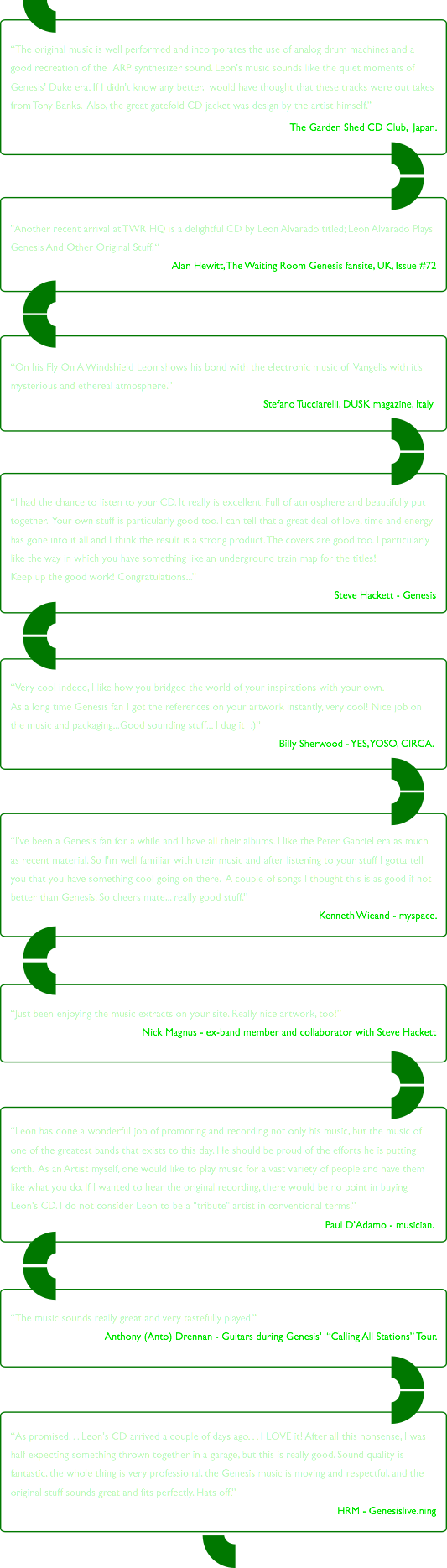 The following quotes are excerpts taken from selected reviews and from comments made by well-respected musicians as well as some fans. To read the full reviews, comments and more, go to Leon’s facebook page and check the “Notes” tab. A link to that page can be found in the “Links” page of this site.